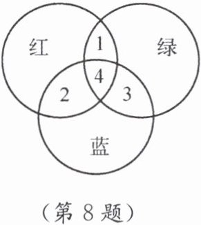 8. 人们把红、绿、蓝三种色光叫作光的______。如图所示,三种色光等比例混合,互相重叠的区域分别是:区域1为______色光,区域2为______色光,区域3为______色光,区域4为______色光。