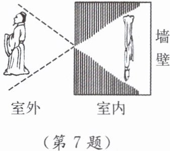 7. 《墨经》中最早记载了小孔成像的现象,该现象是由于光的______形成的。如图所示为书中绘制的示意图,要让室内墙壁上的像看得更清楚,房间内的亮度应较______。当室外的人靠近小孔时,他在墙壁上所成像的大小将变______。