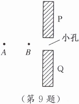 9. 如图所示,PQ为不透光的门板,它上面有一个小孔。若眼睛分别在A、B两处通过小孔观察外面的景物,在哪一处观察的范围更大?为什么?试画出眼睛在B处看到的外面景物的范围(看到的范围用阴影线表示)。
