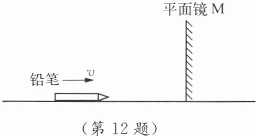 12. 如图所示,平面镜M竖立在水平地面上,长6cm的铅笔平放在地面上且与平面镜垂直,笔尖距平面镜10cm。铅笔以水平向右2cm/s的速度靠近平面镜,则( )。