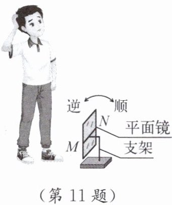 11. 如图所示,竖直放置的小平面镜能绕水平轴MN转动。小明站在平面镜正前方,他在镜中的像____(是/不是)完整的。小明沿着垂直镜面的方向移动了8cm,他与像的距离改变了____cm。为了让他站着就能看到镜中自己脚的像,可以让平面镜绕水平轴MN沿____时针方向转动适当角度。
