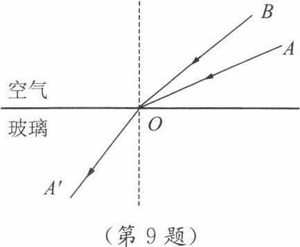 9. 如图所示,OA'是光线 AO 的折射光线。请在图中大致画出入射光线 BO 的折射光线和入射光线 AO 的反射光线。