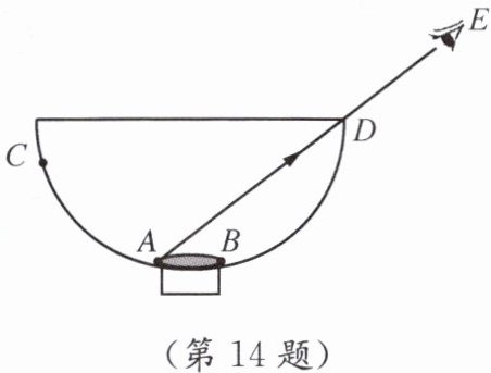 14. 如图所示,人眼在 E 处经碗的边缘 D 点刚好能看到碗底硬币的左边缘 A 点。向碗里缓慢加水,当水面到达 C 处时,人眼仍在 E 处,但能经 D 点看到硬币的右边缘 B 点。用一条光线示意以上光学现象(并画出水面、法线)。