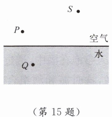 15. 如图所示,由发光点 S 发出的某一条光线射到空气和水的分界面上,同时发生反射和折射。已知反射光线经过点 P,折射光线经过点 Q,请画出光路图。