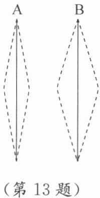 13. 如图所示是两根相同材料的古筝琴弦A、B振动时的情形。经测试,每振动880次,琴弦A用时2s,琴弦B用时4s,则( )。