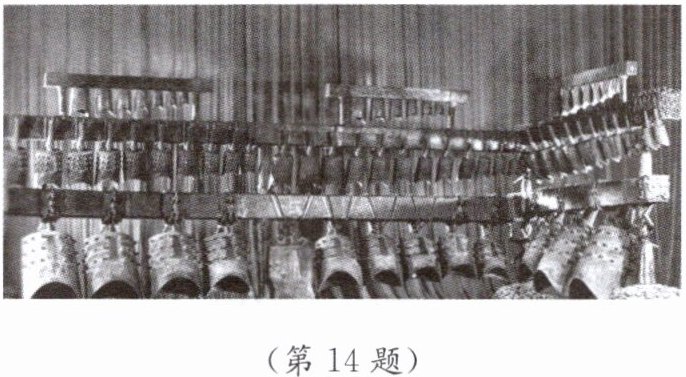 14. 如图所示是湖北随州曾侯乙墓出土的战国时期的编钟。时至今日,人们还能用这套编钟演奏古今乐曲,且音色优美、音域宽广。编钟发出的声音是由于编钟______而产生的。敲击不同的编钟,发出声音的______不同。用大小不同的力敲击同一个编钟,发出声音的______不同。听众能从同一乐曲中分辨出编钟和其他乐器发出的声音,主要是因为它们发出声音的______不同。