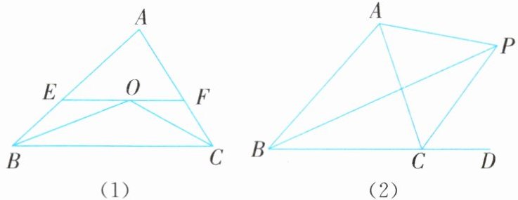 例9 (1)如图(1),在△ABC中,作∠ABC,∠ACB的平分线相交于点O,过点O作EF//BC分别交AB,AC于点E,F.