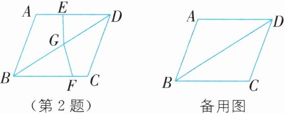 2. (2025·无锡锡山区东亭中学月考)如图,在四边形ABCD中,AD= BC= 4,AB= CD,BD= 6,点E从D点出发,以每秒1个单位的速度沿DA向点A匀速移动,点F从点C出发,以每秒3个单位的速度沿C→B→C做匀速移动,点G从点B出发沿BD向点D匀速移动,三个点同时出发,当有一个点到达终点时,其余两点也随之停止运动.