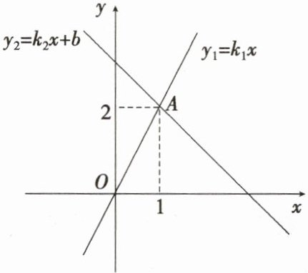 13. 如图,直线$y_1 = k_1x$与直线$y_2 = k_2x + b$相交于点A(1,2)。当$y_1 < y_2$时,x的取值范围是______。