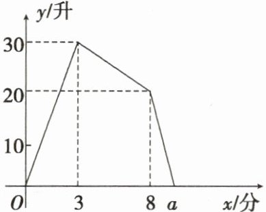 15. 一个装有进水管和出水管的容器,开始时,先打开进水管注水,3分时,再打开出水管排水,8分时,关闭进水管,直至容器中的水全部排完。在整个过程中,容器中的水量y(升)与时间x(分)之间的函数关系如图所示,则图中a的值是______。