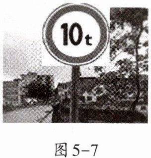 10. 一辆自重是$5.0×10^4N$的卡车行驶到一座立有限重标志的桥前,桥前的标牌如图5-7所示。该卡车装载着20箱货物,每箱货物的质量是300kg,g取10N/kg。问: