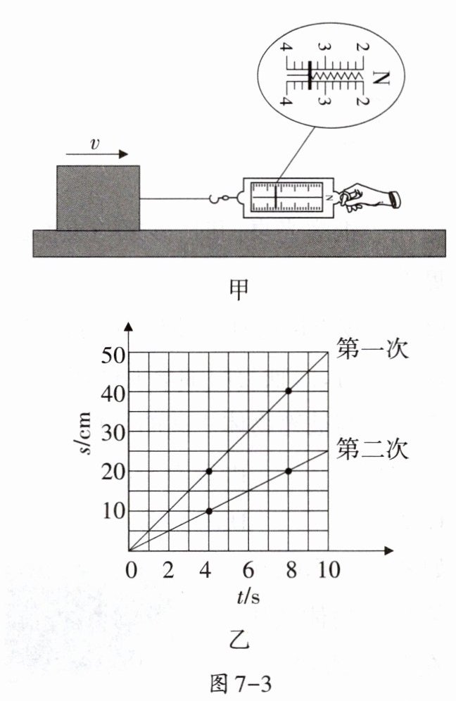 5. 如图7 - 3甲所示,用弹簧测力计两次水平拉同一木块,使它在同一水平木板上做匀速直线运动。图7 - 3乙是该木块运动的路程随时间变化的图像,下列说法正确的是(