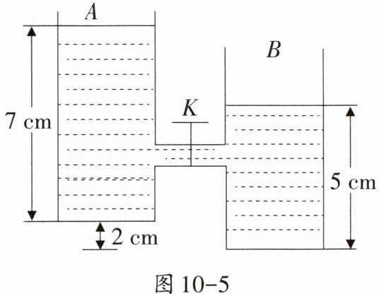 5. 如图10 - 5所示,A、B为完全相同的两个容器,分别盛有7cm、5cm深的水,A、B之间用导管连接。g取10N/kg,关于阀门打开前后出现的现象或结果,下列选项正确的是(