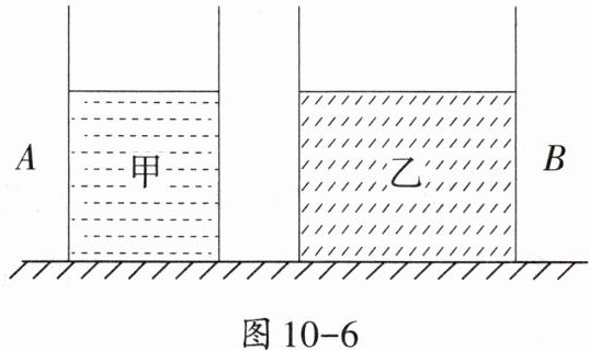 6. 如图10 - 6所示,底面积不同的圆柱形容器A和B分别盛有甲、乙两种液体,两液面相平,且甲液体的质量等于乙液体的质量。若在两容器中分别继续加入一定量的原有液体后,液面仍保持相平,关于此时液体对各自容器底部的压强$p_{甲}$、$p_{乙}和压力F_{甲}$、$F_{乙}$,下列关系式正确的是(