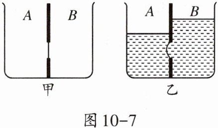 8. 如图10-7甲所示,容器中间用隔板分成大小相同且互不相通的A、B两部分,隔板下部有一圆孔用薄橡胶膜封闭。橡胶膜两侧压强不相等时,会向压强小的一侧凸起。