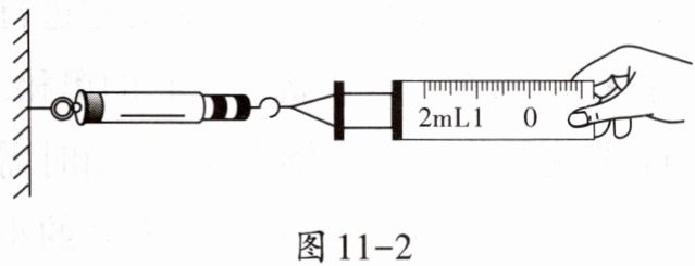 2. 图11 - 2所示是小明利用$V = 2mL$的注射器、弹簧测力计、刻度尺等器材估测大气压值的情景。测出注射器全部刻度长10cm,把活塞推至注射器筒的底端,用橡皮帽封住注射器的小孔,水平向右缓慢拉动注射器筒,当注射器的活塞开始滑动时,记下弹簧测力计的示数为2.1N,不考虑摩擦力的影响,根据此数据就可以估测大气压值。关于本次实验,下列选项正确的是(