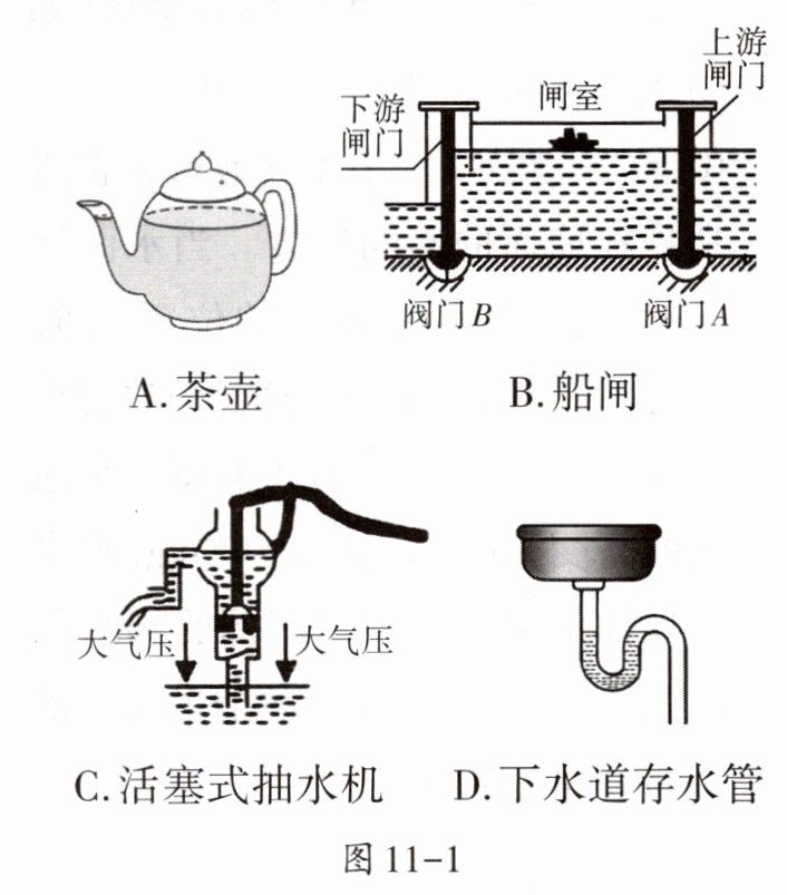 1. 连通器在生活、生产中有着广泛的应用。如图11-1所示的事例中,没有利用连通器原理的是(