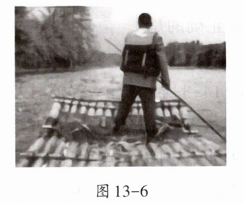 9. 如图13-7所示,竹筏漂流是许多景区的旅游项目之一。现有一竹筏,质量为64kg,体积为$0.8m^3,$已知g = 10N/kg,水的密度$ρ = 1.0×10^3kg/m^3。$竹筏受到的重力是