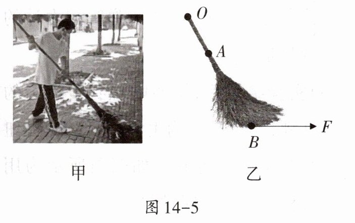6. 如图14-5甲所示为一名中学生用扫帚清扫落叶的情景。图14-5乙是扫落叶时扫帚的简化示意图,O为支点,请在图中画出阻力F的力臂L。