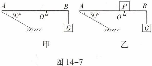 8. 如图14-7甲所示,支点为O、长度为L的轻质杠杆的B端挂一重物G,A端用细绳系于地面上,细绳与杠杆间的夹角为30°,已知OA= 2/3L,OB= 1/3L。此时杠杆在水平位置平衡。