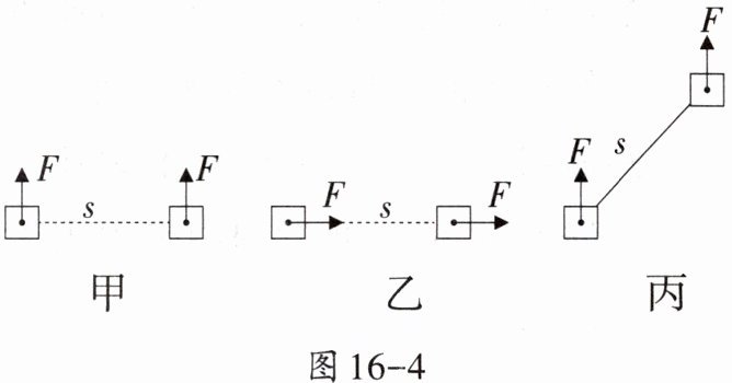 5. 如图16 - 4所示,甲、乙、丙三种情况下,用大小相同的力F使同一物体沿不同的轨迹移动了相同的距离s。关于三种情况下拉力F所做的功,下列关系式正确的是 (