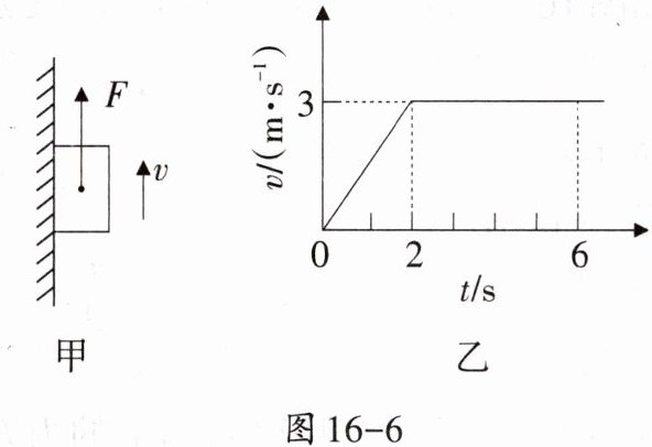 7. 如图16 - 6甲所示,重为5N的铁块吸附在竖直放置足够长的磁性平板上,在竖直向上拉力F的作用下铁块沿直线竖直向上运动,铁块运动过程中速度v的大小随时间t变化的图像如图16 - 6乙所示。若铁块受到的摩擦力为2N,下列说法正确的是 (