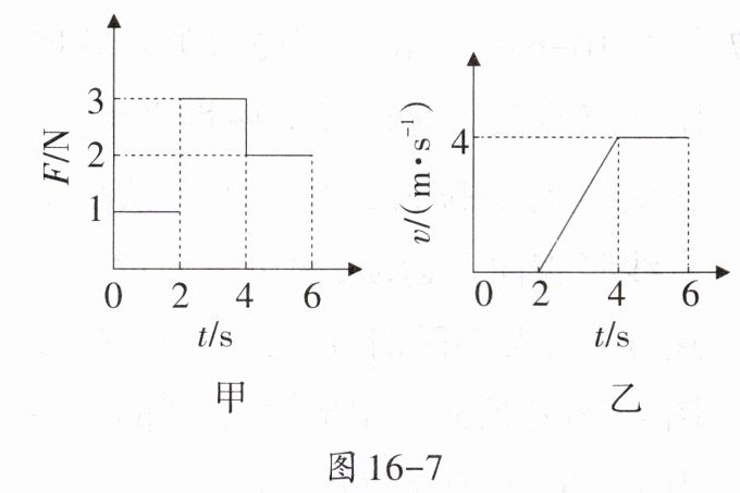 8. 放在水平地面上的物体受到方向不变的水平推力F的作用,F的大小与时间t的关系如图16 - 7甲所示,物体运动速度v与时间t的关系如图16 - 7乙所示。由图像可知,0~2s内物体处于