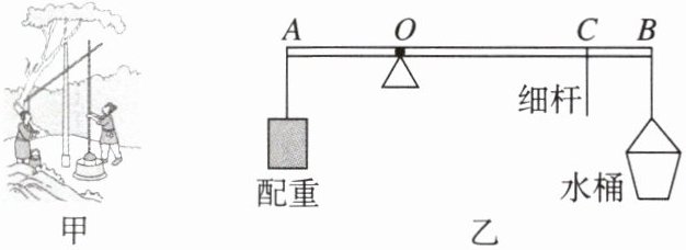 9. 跨学科·传统文化 2024·溧阳一模 《天工开物》中记载了中国古人利用桔槔汲水的情景(如图甲所示),如今一些农田在灌溉时仍然传承着这种汲水方式。据此,小明改制了如图乙所示装置模拟桔槔汲水,横杆AB可绕O处的转轴转动,A处系有配重铁块,B处悬挂水桶,C处连接一根细杆,使用时人可对细杆施加竖直向上的推力或竖直向下的拉力。已知OA长为20cm,OB长为50cm,BC长为10cm。横杆的自重、支点处的摩擦、细杆和悬线以及水桶的重力均忽略不计,为使横杆在水平位置静止,则: