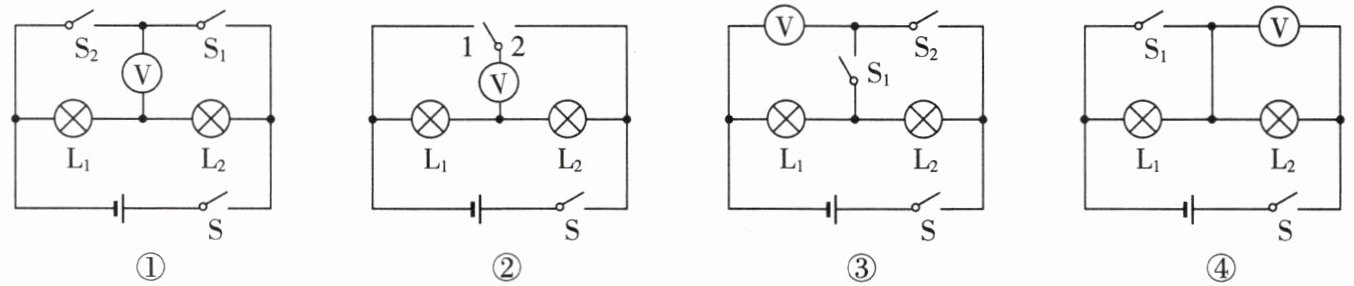 (4)利用本实验结论,如图所示的四个电路图中,只通过开关的断开或闭合就可得到灯$L_{1}和L_{2}$两端电压的是______(填序号)。