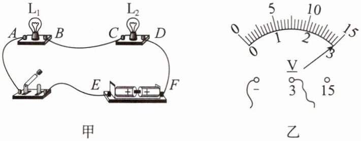 (2)正确安装后,闭合开关,两灯均不发光,小明用电压表试接$A$、$B$接线柱,发现指针偏转情况如图乙所示,则可判断