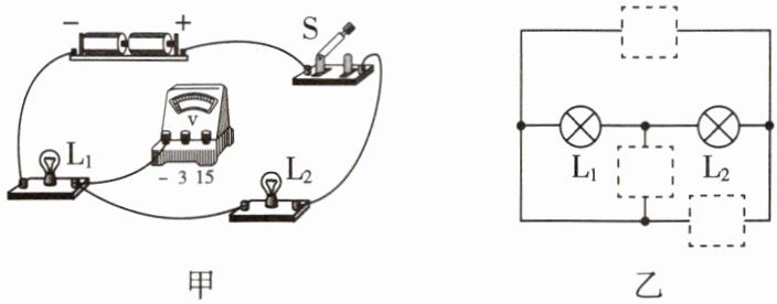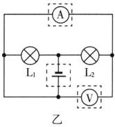 (5)小明在原有实验器材的基础上又增加了一只电流表,组成了并联电路,请在图乙的虚线框中填入电源、电压表和电流表的符号将电路补充完整。