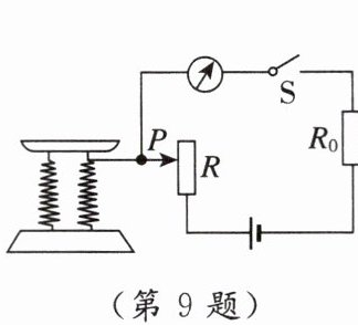 9. 为了减少食物浪费,某自助餐厅开展了“吃多少,盛多少”的活动,在平台上放了一个电子秤,如图所示是电子秤的原理图,$R_{0}$是定值电阻,R是滑动变阻器,它的金属滑片P与弹簧顶端固定在一起,下列说法不正确的是 (