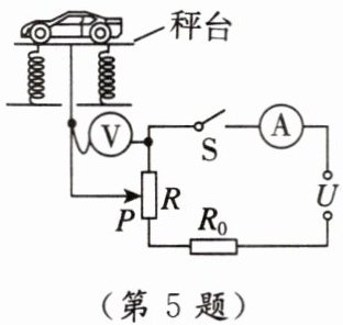 5.跨学科·日常生活如图是地磅工作原理示意图,秤台连在竖直弹簧上,电路与恒压电源连接。未称量时,滑动变阻器R的滑片P在最上端,称量时,滑片P向下滑动。闭合开关S,车辆总质量越大时 (