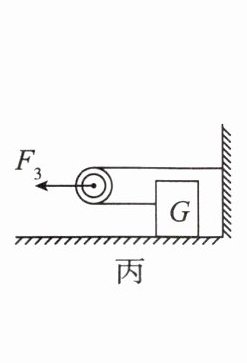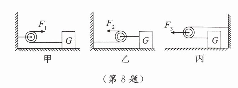 8. (科学思维 科学推理)如图所示,用同一滑轮沿同一水平面拉同一物体做匀速直线运动,所用的拉力分别为$F_1、$$F_2、$$F_3($忽略滑轮重及滑轮与轴之间的摩擦)。下列关系中正确的是(