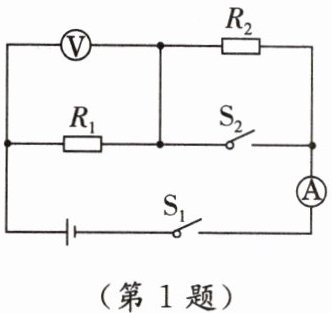 1. 如图所示,电源电压保持不变,闭合开关$S_{1}$、$S_{2}$,电压表示数为6V,电流表示数为0.6A,断开$S_{2}$后,电压表示数变为2V,则$R_{2}$的阻值和电源电压分别是 (