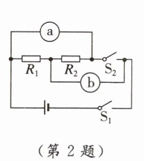 2. [2024·天津改编]如图所示的电路中电源电压不变,a、b为同种电表(电流表或电压表)。闭合$S_{1}和S_{2}$,a、b两表示数分别为3和1(单位为A或V);将a、b换为另一种电表,闭合$S_{1}$、断开$S_{2}$,a表示数为0.4(单位为A或V)。则 (