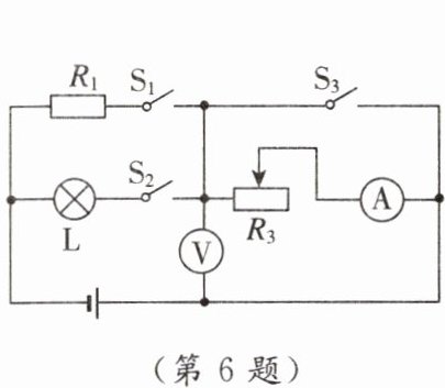 6. [2024·南京六合区月考]在如图所示的电路中,电源电压$U= 5V$,小灯泡L标有“5V 0.5A”字样(电阻不变),电流表的量程为0~0.6A。电压表的量程为0~3V,滑动变阻器$R_{3}$的最大阻值为20Ω,灯泡L的电阻为______Ω,闭合开关$S_{1}$、$S_{2}和S_{3}$时,通过$R_{1}$的电流为0.3A,则电路的总电阻为______Ω;若换6V的电源,只闭合开关$S_{2}$,在不损坏各元件的情况下,$R_{3}$的阻值变化范围为______。