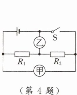 4. 如图所示的电路中$R_{1}:R_{2}= 1:2$,当开关S闭合,甲、乙两表均为电压表时,两电压表示数之比为