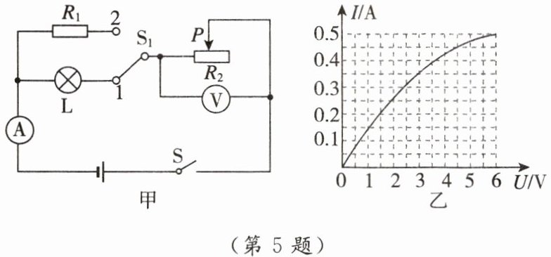 5. [2024·重庆]如图甲所示,电源电压不变,电流表量程为0~0.6A,电压表量程为0~3V,定值电阻$R_{1}$大于5Ω,滑动变阻器$R_{2}$的规格为“20Ω 1A”,小灯泡L的电流随其两端电压变化的图像如图乙所示。若闭合开关S、$S_{1}$接1,在电路安全的情况下,变阻器$R_{2}$允许接入电路的最大阻值为15Ω,则电源电压为______