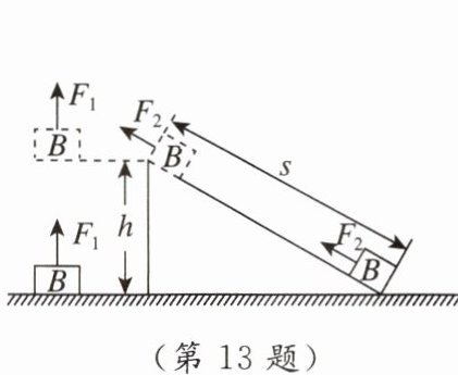 13. [2024·南京玄武区期中]如图所示,用大小为$F_{1}$的力直接将物体B匀速提升高度h,$F_{1}$做功120J,用大小为$F_{2}$的力沿斜面把物体B匀速拉至相同高度,B沿斜面通过的距离s= 2h,斜面的机械效率为80%,则$F_{2}$做功______J,$F_{1}:F_{2}= $______。若s= 3m,则B与斜面间的摩擦力为______N。