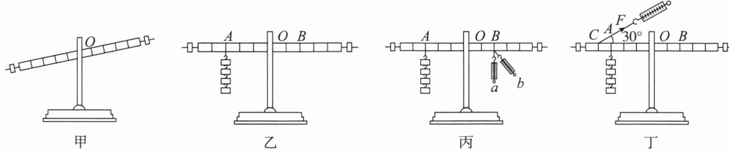 ;小明经过多次实验,分析实验数据得出了杠杆的平衡条件。(4) 如图丁所示,已知每个钩码重 0.5N,杠杆上每个小格长度为 2cm,当弹簧测力计在 C 点斜向上拉(与水平方向成 30°角)杠杆,使杠杆在水平位置平衡时拉力 F 的力臂大小为
