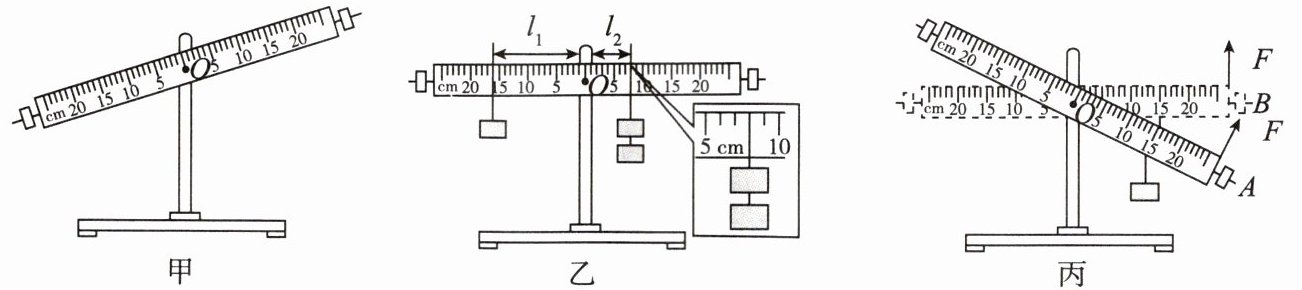 。(4)如图丙,$F$始终与杠杆垂直,将杠杆缓慢地由位置$A拉至位置B$的过程中,$F$的大小将