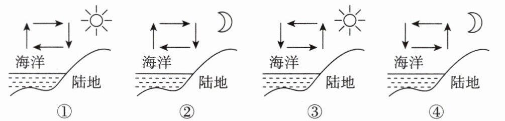 7. [2024·南通海门期中] 在沿海地区炎热晴朗的天气里,易形成海陆风,这是由于陆地和海洋升温和降温的快慢不同,从而使空气对流形成的。如图所示的四幅海陆风示意图中,对近地面大气运动方向的判断正确的是(