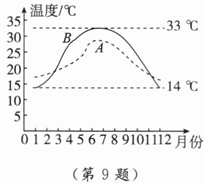 9. [2024·宿迁泗阳期中] 如图是某一内陆城市与某一沿海城市年气温变化曲线。从图像可以看出,在一年中,曲线 B 所示的城市气温变化较