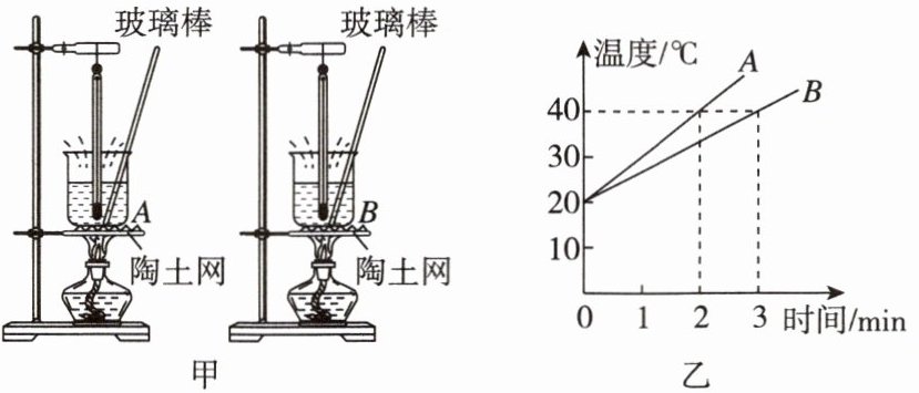 (4)根据实验数据,小明绘制了两种液体的温度随时间变化的图像如图乙所示,分析可知,两温度计示数都升高到$40^{\circ }C$时,A增加的内能