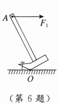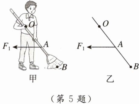 5. (新趋势 真实情境 爱学习爱劳动,小张常帮妈妈做家务。如图甲是小张用笤帚在水平地面扫地,如图乙是简化图,以O为支点,作用在A点的动力为$F_1。$请在图乙中画出$F_1$的力臂$l_1$及作用在笤帚上B点阻力$F_2$的示意图。