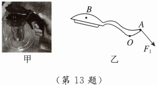 13. [2024·无锡梁溪区期中] 如图甲所示,开启茶壶盖时,壶盖可看作一个杠杆。请在图乙中画出开启茶壶盖时的动力$F_1$的力臂l,并在B点画出阻碍壶盖转动的阻力$F_2。$