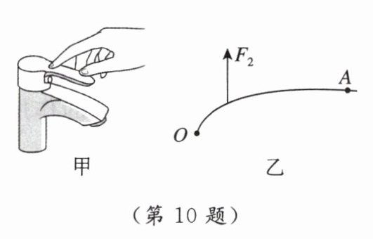 10. 新趋势 真实情境 如图甲是用水后及时关闭水龙头时的情景,水龙头手柄可看作是一个杠杆,请你在图乙所示的示意图中画出施加在A点的最小动力$F_1$及$F_1$的力臂$l_1。$
