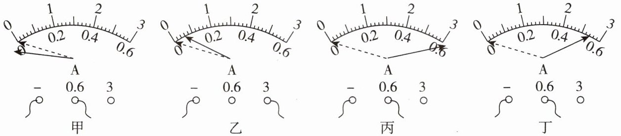 15. [2024·西安鄠邑区期中]甲、乙、丙、丁四名同学在做“用电流表测电流”的分组实验,闭合开关前,他们的电流表指针均指在零刻度处。当甲、乙、丙三名同学闭合开关试触时发现,电流表指针摆动分别出现了如图甲、乙、丙所示的三种情况。请分析他们在电流表的使用上分别存在什么问题,丁同学正确使用电流表,电流表指针变化如图丁所示,请写出他测量电流的大小。