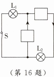 16. 科学思维·科学推理 [2024·南京联合体期中]如图,根据电流流向,在图中方框内分别画上电流表和电源(用元件符号表示),使电路成为完整的并联电路。